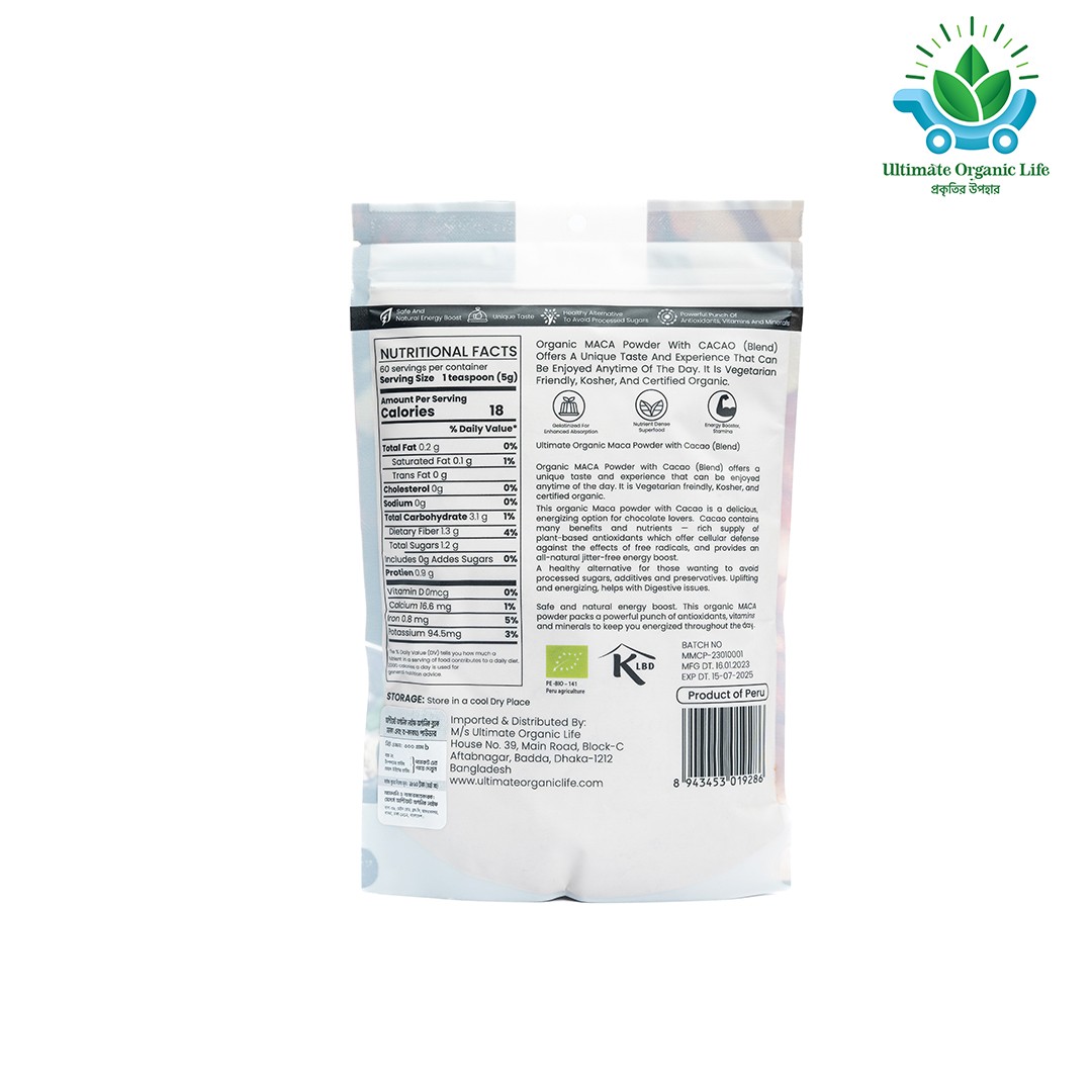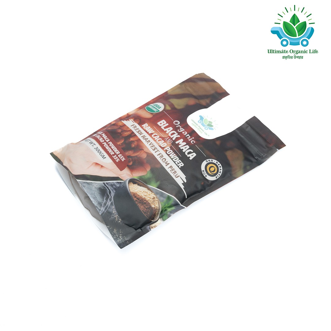 • একটি শক্তিশালী হারবাল ব্লেন্ড যেখানে Black Maca Root (65%) এবং Raw Cacao (35%) রয়েছে।